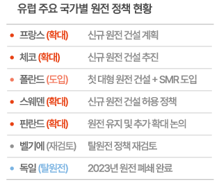 프랑스·체코·폴란드 등 여러 유럽 국가들은 신규 원전 건설과 SMR(소형 모듈 원자로) 같은 차세대 기술 투자를 확대하고 있음. |
