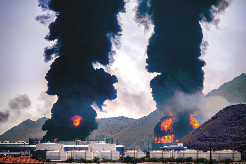 지난 14일(현지시간) 이란으로부터 드론 공격을 받은 아랍에미리트(UAE) 푸자이라 항구의 석유 저장 시설에서 검은 연기가 치솟고 있다. 푸자이라 항구는 호르무즈 해협을 거치지 않고도 원유를 수출할 수 있는 대표적인 우회 통로다. /사진=AFP연합뉴스